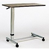 Easily assembled, over bed table with wood grain laminated top measures 30" x 15". Height adjusts from 28" to 45".